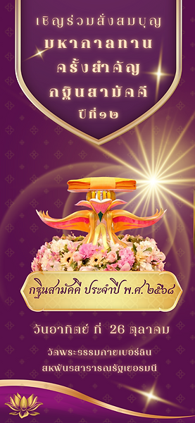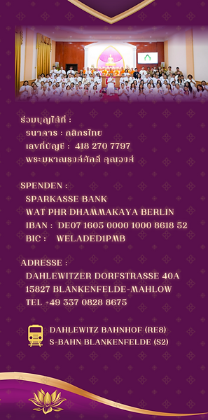 Wat Phra Dhammakaya Berlin ist eine gemeinnützige Buddhistische Organisation, die auf persönlicher Entwicklung basiert. Die Stiftung hat zum Ziel, Aktivitäten zur Wiederherstellung der Moral in Individuum, Familie, Gesellschaft und Welt zu fördern.